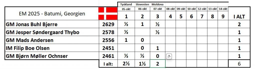 Sverige vandt overraskende 3 – 1 over Østrig, der ellers var favoritter på alle brætter, og er nu nummer 16 i den samlede stilling. Danmark er nummer 21, præcis vores seedning inden start.