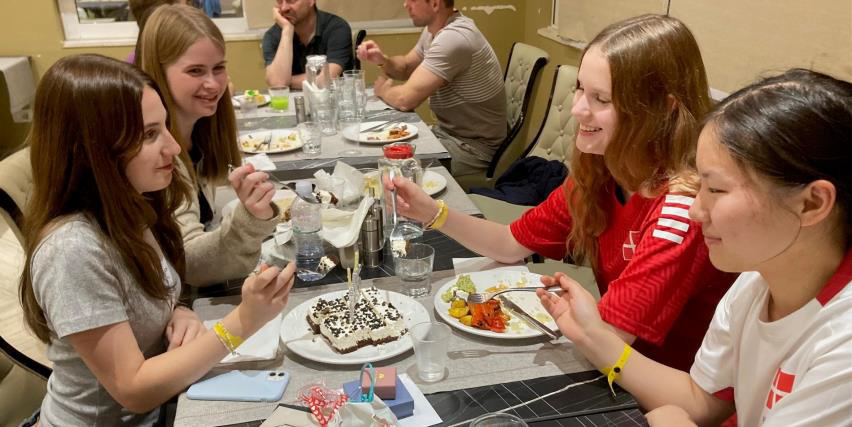 Efter runden samledes alle danskere i restauranten for at fejre Sarah med gaver, sang og kage.