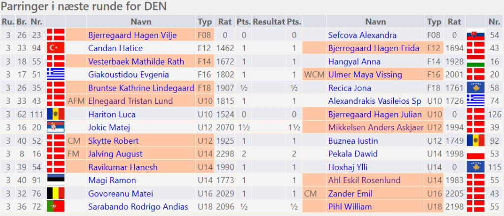 Bedste bud på en dansk medalje, FM August Jalving, er seedet helt oppe som nr. 16 af 116 deltagere i U14 og vandt sikkert i 1. runde. I alt scorede danskerne 7½ point af 14 i 1. runde, men de vindere, som er seedet i øverste halvdel, får det væsentligt sværere i 2. runde. Turneringen omfatter ni partier og slutter 7. november.”