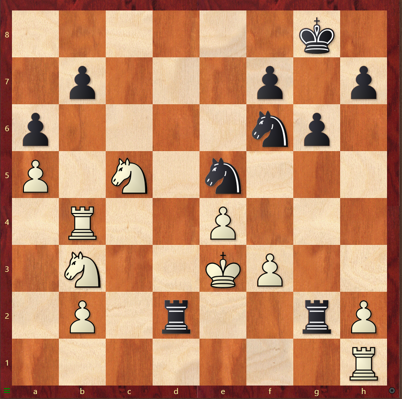 Nedenfor ses diagramstilling af partiet, Ramon Magi (1773) – Eskil Rosenlund Ahl (1983). Kan du finde den forcerede mat-i-7!? Sort trækker (løsning i slutningen af artiklen)