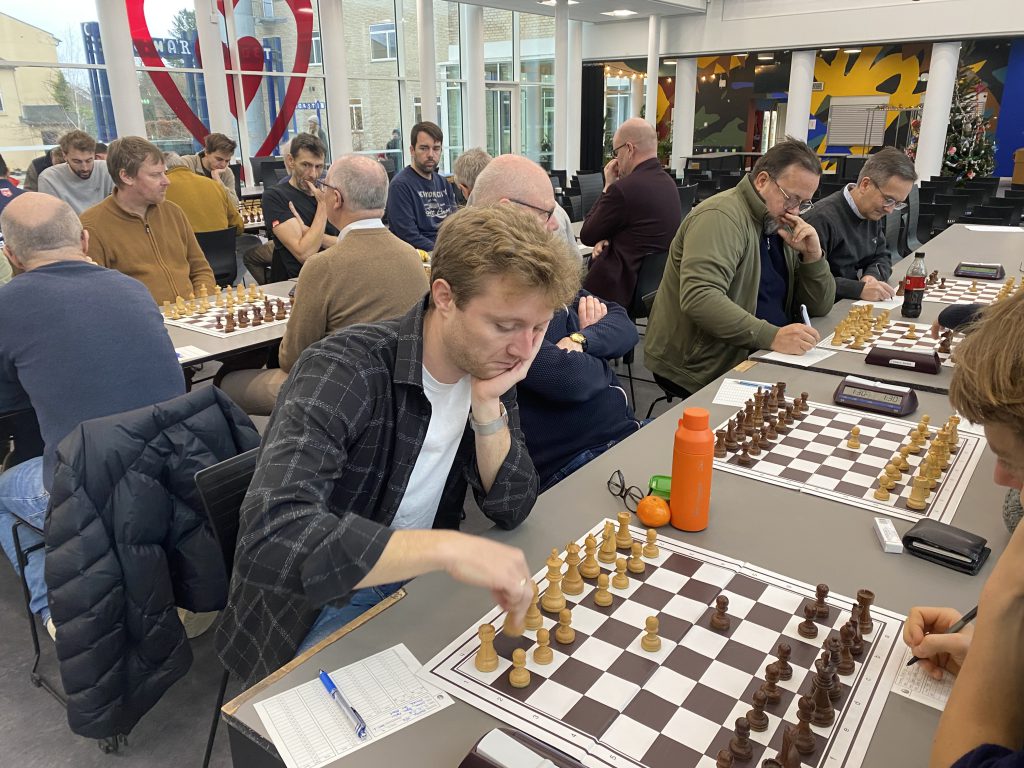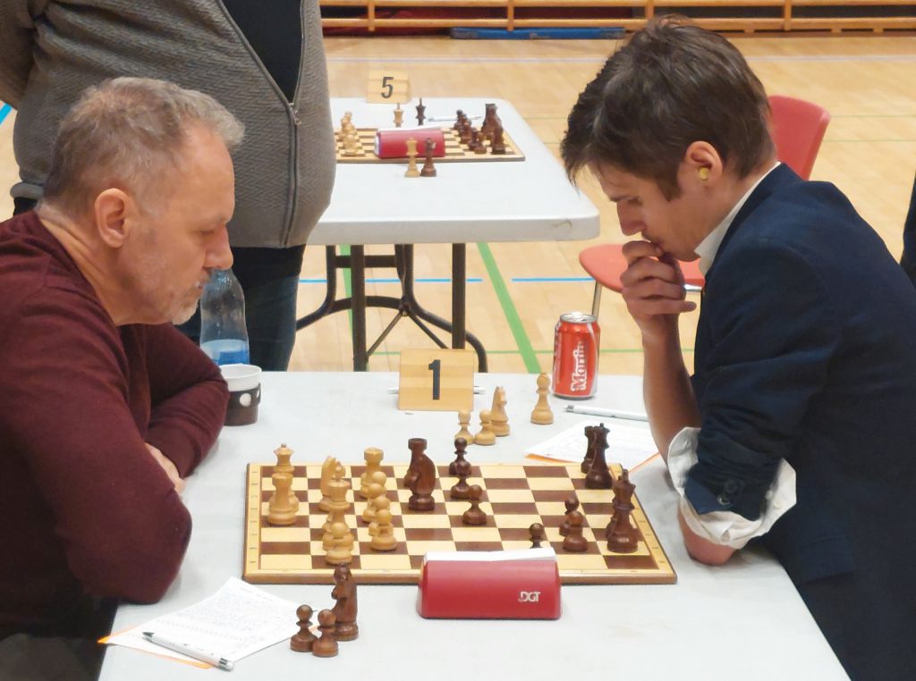 På Jan Rosenbergs foto øverst i artiklen ses Skanderborgs Vitus Bondo Medhus med hvid vinde over Adrian Stenstrop Thorsen fra Fredericia. Vitus Bondo Medhus og klubkammerat IM Nicolai Vesterbæk Pedersen er de eneste spillere tilbage med maksimumpoint.