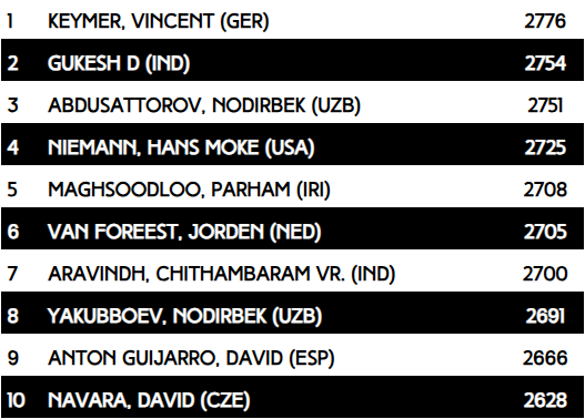 I den åbne gruppe med over 300 deltagere er GM Suri Vaibhav (2569) fra Indien, GM Juca Moroni (2563) fra Italien og GM Simen Agdestein (2562) favoritter.